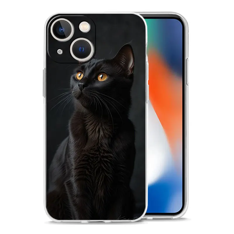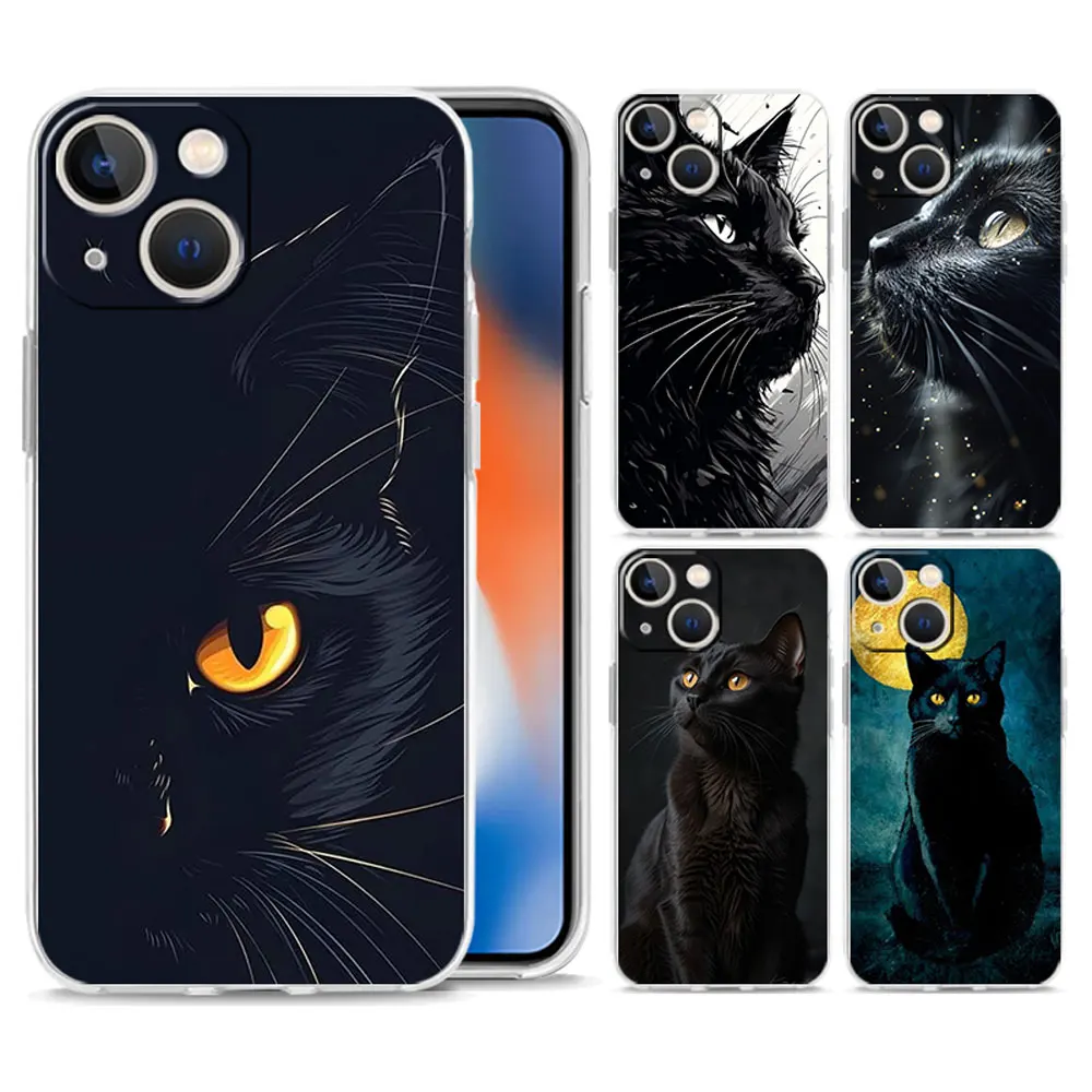 Phone Case For iPhone 16 15 14 13 12 11 Pro Max XS X XR 7 8 Plus soft Shockproof TPU Clear Cover Black Cat